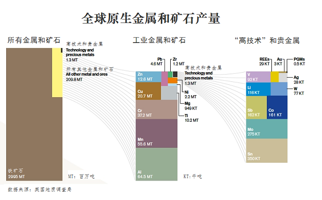 “需要特别说明的是,这些高技术-关键元素一般作为主要金属生产的共生产品或副产品。这些元素很可能由大型矿业公司生产,但是它们很容易受到主要金属需求变化的影响”,报告称。