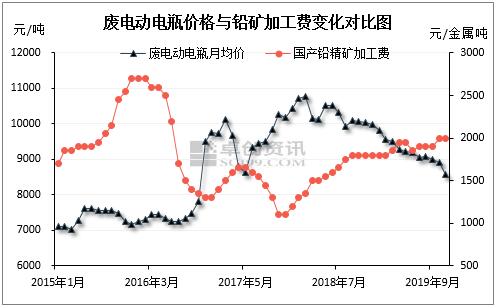 原因有两点:1、铅价行情不好,市场总需求有限,再生铅厂为了规避风险,降价采购的意愿较强。2、作为重要的原材料,废电瓶与铅精矿之间的替代性作用明显,今年铅精矿供应量充裕,加工费大涨,吸引炼厂采购铅精矿,一定程度上削弱了部分炼厂对于废电瓶的依赖度,令其价格承压。数据显示,2019年1-9月我国进口铅精矿1249.85千吨,较去年同期增加359.58千吨,增幅40.39%。