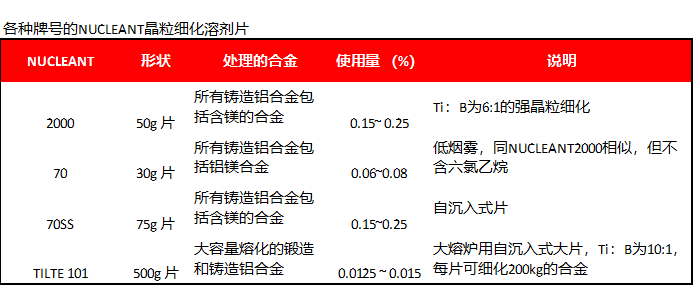 下表所示的是NUCLEANT系列晶粒细化块产品。这类产品中的部分盐会吸潮,它暴露在大气中可能会从大气中吸收一些水分,这样有可能增加合金中的氢含量,因此,建议先细化后除气。