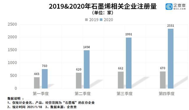 从季度注册量来看,企查查数据显示,2020年我国石墨烯相关企业注册量按季度呈阶梯增长趋势,第一季度的注册量最少,为760家,第四季度注册量最多,为2331万家。