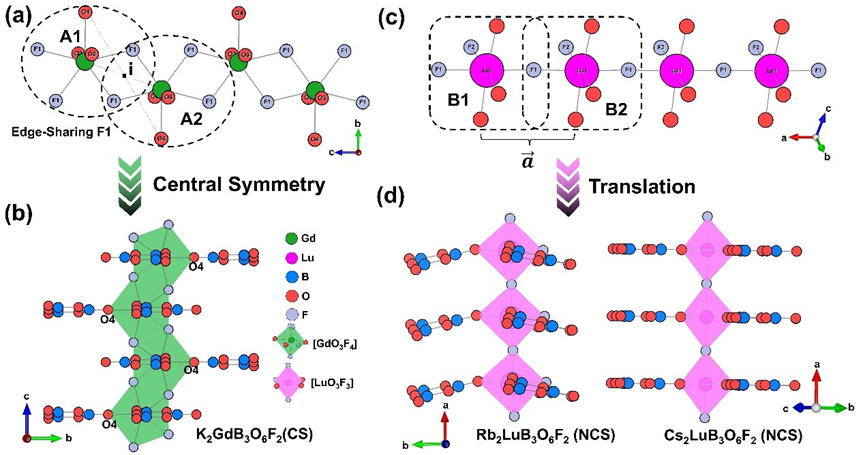 中国科学院新疆理化技术研究所晶体材料研究中心长期从事硼酸盐新型紫外、深紫外光电功能晶体的研究。该团队在协同优化策略的指导下,成功合成了三种新型稀土金属硼酸盐氟化物,K2GdB3O6F2、Rb2LuB3O6F2和Cs2LuB3O6F2。实验表明三个标题化合物都表现出小于200 nm的短截止边,其中Cs2LuB3O6F2表现出1.5×KH2PO4的实验倍频效应。计算显示Rb2LuB3O6F2和Cs2LuB3O6F2的I类最短相位匹配波长分别为210和202 nm,这说明它们有潜力通过Nd:YAG激光器的五次谐波产生过程直接输出213 nm的相干光。更重要的是,从中心对称的K2GdB3O6F2到非中心对称的Rb2LuB3O6F2和Cs2LuB3O6F2的结构演化表明,稀土金属多面体配位严重影响了[B3O6]基团的排列和取向,对结构最终的对称性起着决定性作用。