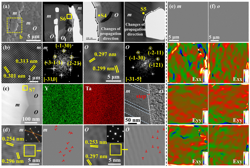针对以上国际性难题,陈琳/冯晶团队十余年来深耕铁弹性陶瓷热防护涂层材料领域,在本研究中通过球差矫正透射电镜原子级别表征提出了铁弹畴增韧新理论,首次直接揭示了在应力作用下铁弹畴通过偏转裂纹、畴转变、裂纹桥接等方式消耗断裂能提高断裂韧性;同时,研究团队在铁弹性陶瓷中通过引入与其具有类共格界面的增强相,并通过SPS和高温热处理的方式加速元素迁移,在晶格中引入高密度位错,在脆性陶瓷中构建了“铁弹畴+高密度位错”增韧新机制。铁弹性复合陶瓷断裂韧性最高值可达5.0 MPa·m1/2,相较于单相材料提高达100%,断裂韧性是传统YSZ材料的1.4倍。