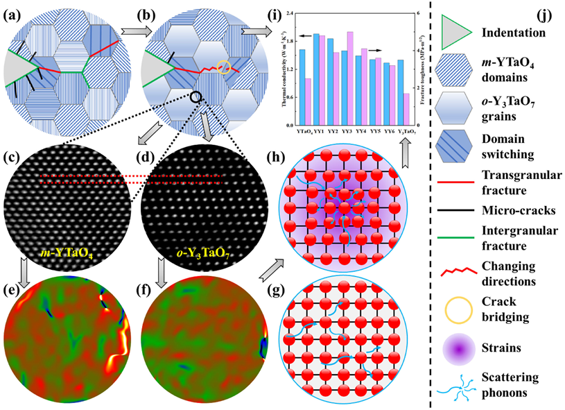 近日,昆明理工大学材料科学与工程学院、金属先进凝固成形及装备技术国家地方联合工程研究中心、中国稀土学会热防护材料专业委员会陈琳/冯晶团队在国际顶刊Advanced Materials以“Breaking the Trade-Off Relationship Between Thermal Conductivity and Toughness of Ferroelastic Oxide Ceramics via a High-Density Dislocation Strategy”为题,报道了团队最新成果。研究团队构建了“铁弹畴+高密度位错”的稀土陶瓷增韧新机制,为实现高韧性、低导热超高温稀土陶瓷热障涂层材料的创制提出了新思路。高韧性、低热导是保障稀土陶瓷热防护涂层材料长寿命、高隔热的核心性能指标,但是在稀土陶瓷中其热导率与断裂韧性之间存在相互耦合限制的关系。稀土陶瓷硬而脆,高硬度意味着高的声子传播速度,从而产生高的热导率,传统性能优化方式难以打破脆性稀土陶瓷“高韧性-低热导率”之间的耦合限制关系。铁弹性稀土钽/铌酸盐陶瓷在升降温的过程中通过原子的微小偏转及移动完成二级铁弹性相变,使其服役温度可超过1500℃,是下一代的超高温热障涂层材料。室温下通过铁弹畴特有的畴偏转裂纹、畴转变、裂纹桥接等多重增韧机制使其断裂韧性远高于其他陶瓷,为高韧性陶瓷的研发提供了新思路。但是,相邻晶粒之间的畴取向差异导致晶界结合强度不足,裂纹主要通过沿晶断裂的方式进行,少量晶粒穿过铁弹畴,因而铁弹畴增韧效果有限。