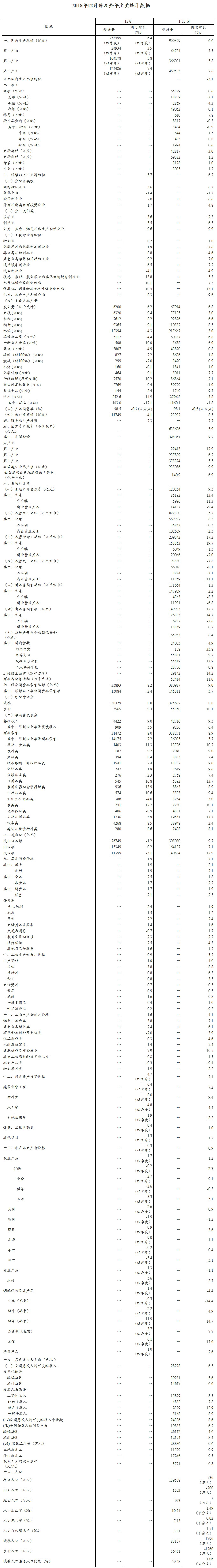 总的来看,2018年国民经济继续运行在合理区间,实现了总体平稳、稳中有进。同时也要看到,经济运行稳中有变、变中有忧,外部环境复杂严峻,经济面临下行压力,前进中的问题必须有针对性地解决。2019年,我们要以习近平新时代中国特色社会主义思想为指导,继续抓住并用好重要战略机遇期,坚持稳中求进工作总基调,坚持新发展理念,坚持推动高质量发展,坚持以供给侧结构性改革为主线,继续打好三大攻坚战,着力激发市场活力、需求潜力和内生动力,统筹推进稳增长、促改革、调结构、惠民生、防风险工作,宏观政策要强化逆周期调节,结构性政策要强化体制机制建设,社会政策要强化兜底保障功能,保持经济持续健康发展和社会大局稳定,为全面建成小康社会收官打下决定性基础,向中华人民共和国成立70周年献礼!