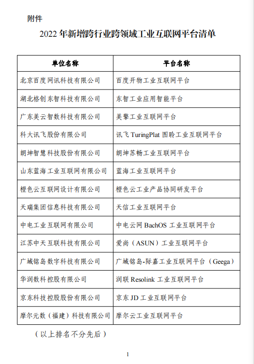 为进一步贯彻落实《中华人民共和国国民经济和社会发展第十四个五年规划和2035年远景目标纲要》关于“在重点行业和区域建设若干国际水准的工业互联网平台”的重要部署,按照《工业和信息化部办公厅关于组织申报2022年跨行业跨领域工业互联网平台的通知》(工信厅信发函〔2022〕38号)的工作安排,经企业申报、地方推荐、专家评审等环节,形成了2022年新增跨行业跨领域工业互联网平台清单。