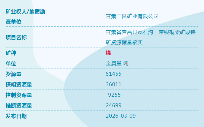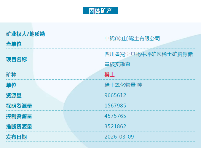 日前从自然资源部获悉,我国新一轮找矿突破战略行动再添新成果,四川冕宁、甘肃宕昌发现固体矿产,分别是稀土、萤石、重晶石、锑。