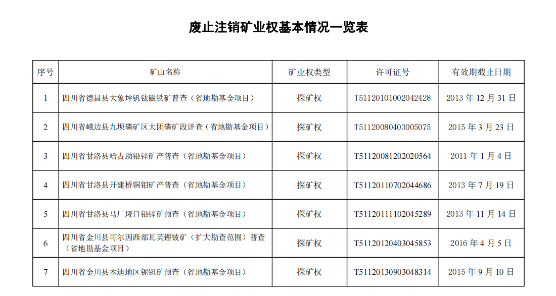 关于废止注销“四川省德昌县大象坪钒钛磁铁矿普查(省地勘基金项目)”等9宗探矿权的公告