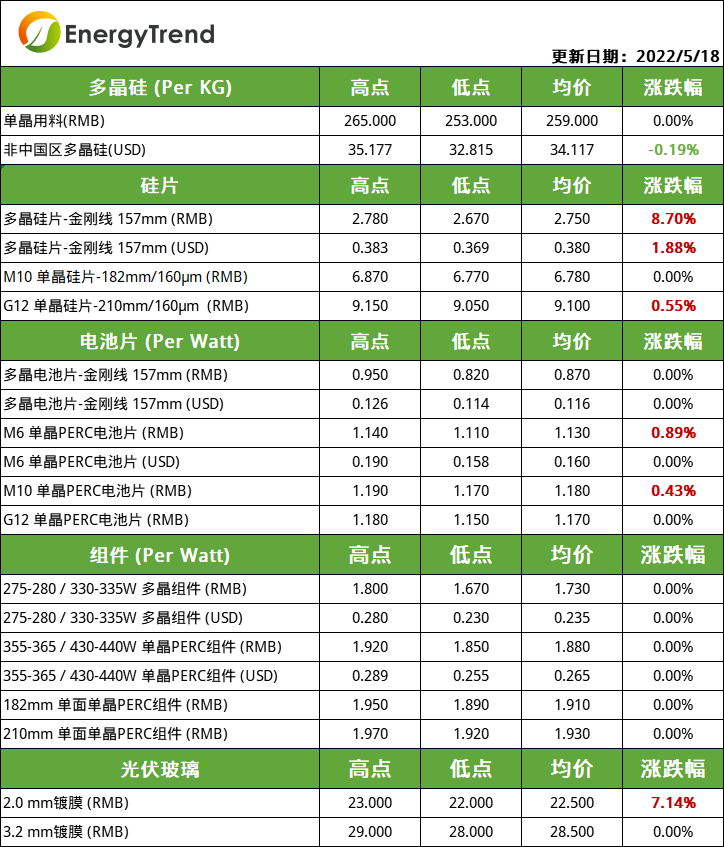 本周硅料价格基本持稳,整体单晶用料的人民币报价维持在259元/KG左右。各硅料企业5月订单大多签完,本周新签订单较少,硅料价格基本持稳。受疫情及限电影响,国内现有产能及扩产产能都受到影响,随着海运物流的缓解,进口量有望增加,供给总量小幅提升,但高景双良等硅片企业有大量产能释放,增加对硅料的需求,整体仍将供不应求。短期内,部分散单急单仍会支撑硅料价格小幅上涨,观察硅料环节的生产运行及出货情况,目前硅料企业大多满产运行,且无库存压力,OCI马来西亚检修将于6月复产释放。有料企反馈,市场再现“拥硅为王”局面,即使在价格可观的情况下,料企并不着急出货,根据付款方式及客户情况等多方面的因素判断是否出货,看好后市价格,惜售心态明显。