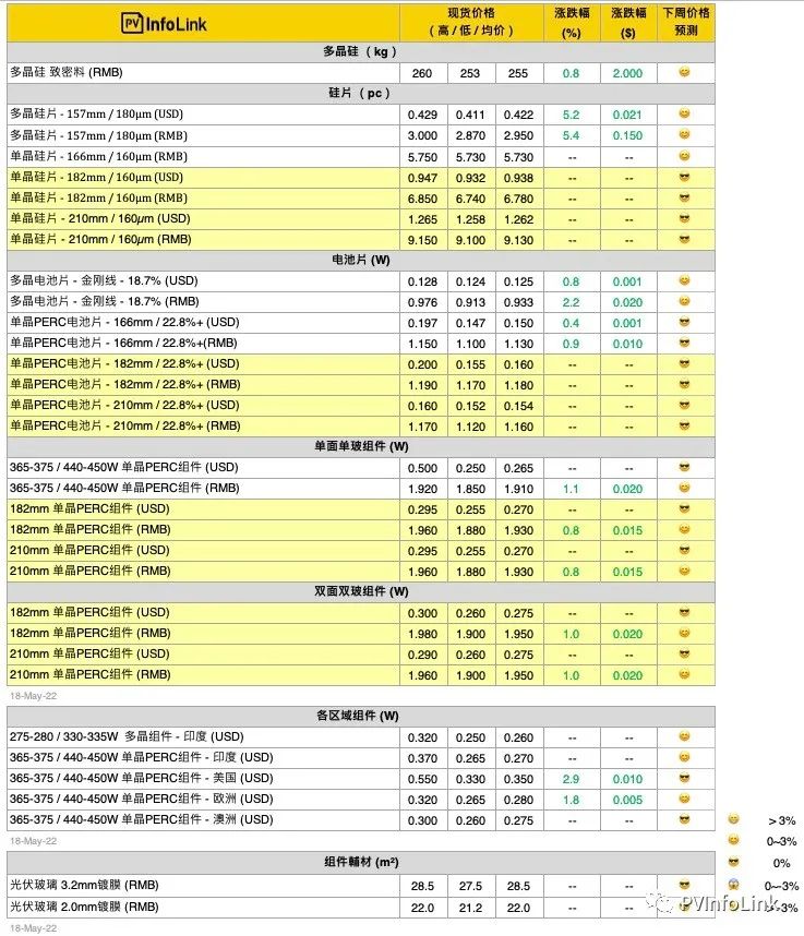 5月18日,PVInfoLink发布本周光伏供应链价格,多晶硅片、多晶电池片、单晶PERC电池片(166mm)、单晶单玻PERC组件(182、210)、双面双玻PERC组件(182、210)均有上涨。
