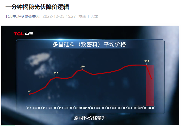 25日,TCL中环投资者关系官微发布《一分钟揭秘光伏降价逻辑》,短片显示,多晶硅致密料平均价格已由303元/kg的最高价降至200元/kg左右,产业链价格加速下跌,是行业回归平价上网的正常表现,2023年有望成为需求放量大年。