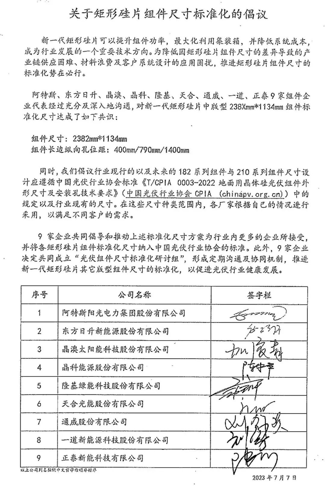 阿特斯、东方日升、晶澳、晶科、隆基、天合、通威、一道、正泰9家(按企业名拼音首字母顺序排列)组件企业代表经过充分及深入地沟通,对新一代矩形硅片中版型238Xmm*1134mm组件标准化尺寸达成了如下共识: