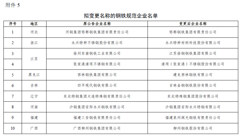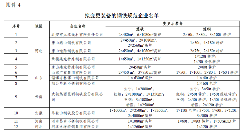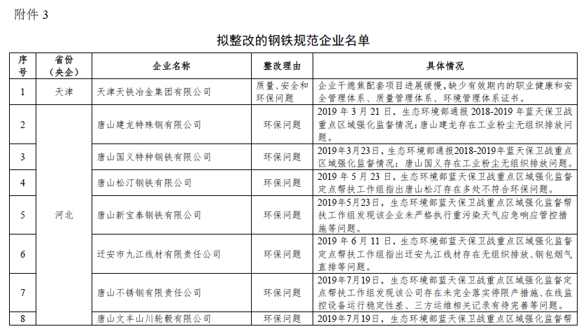 根据《钢铁行业规范条件(2015年修订)》和《钢铁行业规范企业管理办法》,工业和信息化部持续开展钢铁规范企业动态调整工作。经企业自查、地方工业主管部门初审、工业和信息化部组织专家核实,其中,13家企业符合《钢铁行业规范条件》,拟列入规范企业名单;7家企业存在未通过地方初审、冶炼设备拟全部关停退出等情形,拟撤销规范公告;13家企业存在环保、安全等问题,拟责令整改;12家企业冶炼装备变化、10家企业名称变化,拟予以变更。