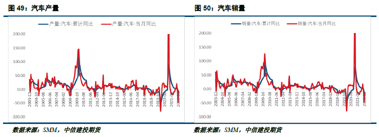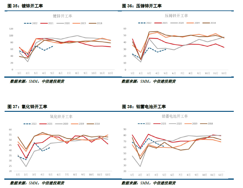 初端产成品来看,镀锌板库存较往年同比较低,镀锌板库存偏低是因为今年国内镀锌企业开工率持续低位,镀锌整体处于供需两弱的局面。上海封城期间镀锌企业原材料短缺问题严重,供给较需求受影响更大,造成镀锌企业库存处在偏低水平。压铸锌行业原料库存量偏低,产成品库存在显著去化后近期有所反弹,这也反映出在疫情期间,整体行业普遍出现了成品去库,随着交通运输的恢复,下游逐渐补充原料,提速生产,导致产成品在近期有所堆积。