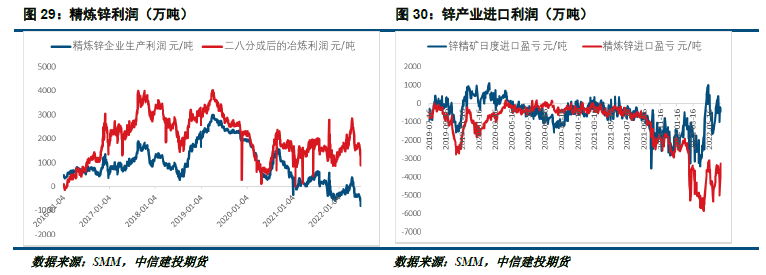从锌的冶炼端来看,前期由于内外锌价严重倒挂,使得冶炼端利润受到了很大的冲击,目前如果不采取加工手册的计算方式,也不计入副产品的利润,冶炼厂的冶炼利润情况较差。但是如果计入锌冶炼与上游矿山的二八分成机制,那么冶炼厂基本上能维持在1000元/吨的利润,处在历史均值的低点,但不足以影响企业的开工情况。而目前进口锌的利润情况依然较差,内弱外强格局维持,短期内很难扭转,这也使得国内精炼锌在上半年进口量较小。