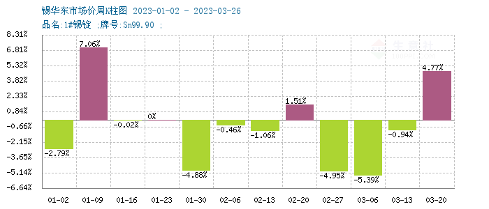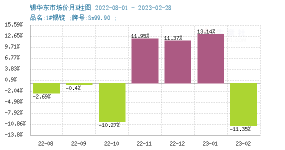 商品价格K柱图,运用价格走势K线的理念,以柱状图形式,反映每周或者每月的价格涨跌变化,投资者可以根据K柱图的变化,来进行买卖投资。红色表示:上涨;绿色表示:下跌;K柱高度表示:涨跌幅度。从月K柱图可以看出近6个月锡价下行为主,下跌幅度较大的月份为5月的-18.54%和6月的-22.32%,进入11月后价格上行为主,单月涨幅均超10%。进入2月后市场下行,单月下跌11.35%,从周K柱图可以看出近期锡价跌多涨少。