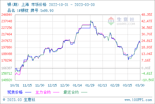2023年3月国内1#锡锭市场“V”型走势。国内市场均价月初在206860元/吨,月末在204860元/吨,月跌0.97%。