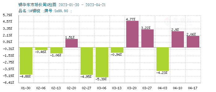 商品价格K柱图,运用价格走势K线的理念,以柱状图形式,反映每周或者每月的价格涨跌变化,投资者可以根据K柱图的变化,来进行买卖投资。红色表示:上涨;绿色表示:下跌;K柱高度表示:涨跌幅度。从月度K柱图可以看出2022年11月后受宏观因素影响,锡价连续上涨3个月,自2023年2月价格单月下跌11.35%。从周度度K柱图可以看出锡锭市场近期波动频繁,整体走势偏弱,本周受佤邦拟停产消息影响,锡价上行。