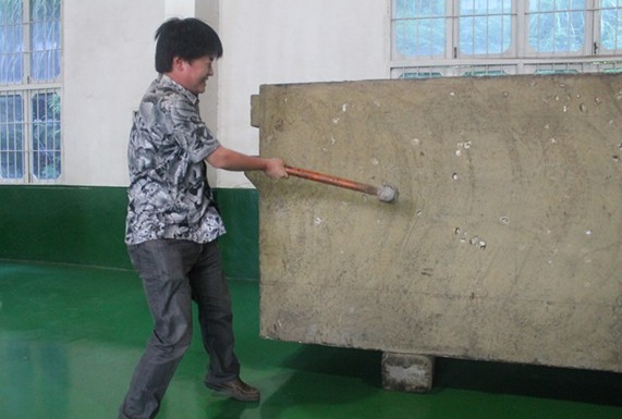 林董事长还亲自带领我们去参观了电解槽发展历史展览厅,并详细地讲解了其特点。其中,最让人记忆深刻的就是洛阳全通窑业有限公司经理王哲举起24磅大锤对着电解槽面板用力击打的那一下,敲击声不仅响彻整个展览厅,还敲出了我们中国人的骄傲。电解槽依然完好无损的矗立着。