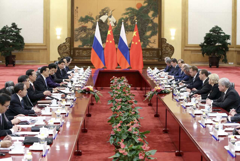 李克强指出,中俄都是新兴市场国家,互为最大邻国,发展好两国关系对于促进地区乃至世界的和平、稳定与繁荣具有重要意义。中方愿同俄方一道努力,推动丝绸之路经济带建设与俄方发展战略以及欧亚经济联盟建设对接,更好促进两国各自发展振兴,也为地区和世界经济发展提供新动能。