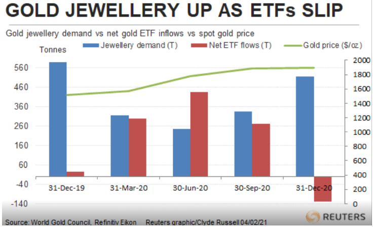 近期,ETF资金流入似乎趋于稳定,截至周三,最大的基金SPDR Gold Trust持有3721万盎司,略低于2020年底的3764万盎司。