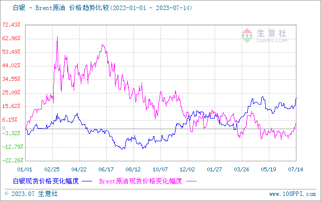 据生意社商品行情分析系统,2023年7月14日白银市场均价5808元/千克,较月初(7月1日)白银市场均价5432.33元/千克,上涨6.92%。