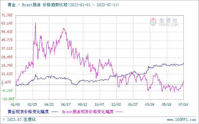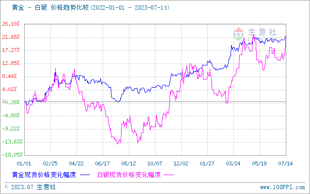 7月贵金属价格上行。据生意社商品行情分析系统,2023年7月14日黄金现货市场价格454.47元/克,较月初(7月1日)黄金现货市场价格448.60元/克,上涨1.31%