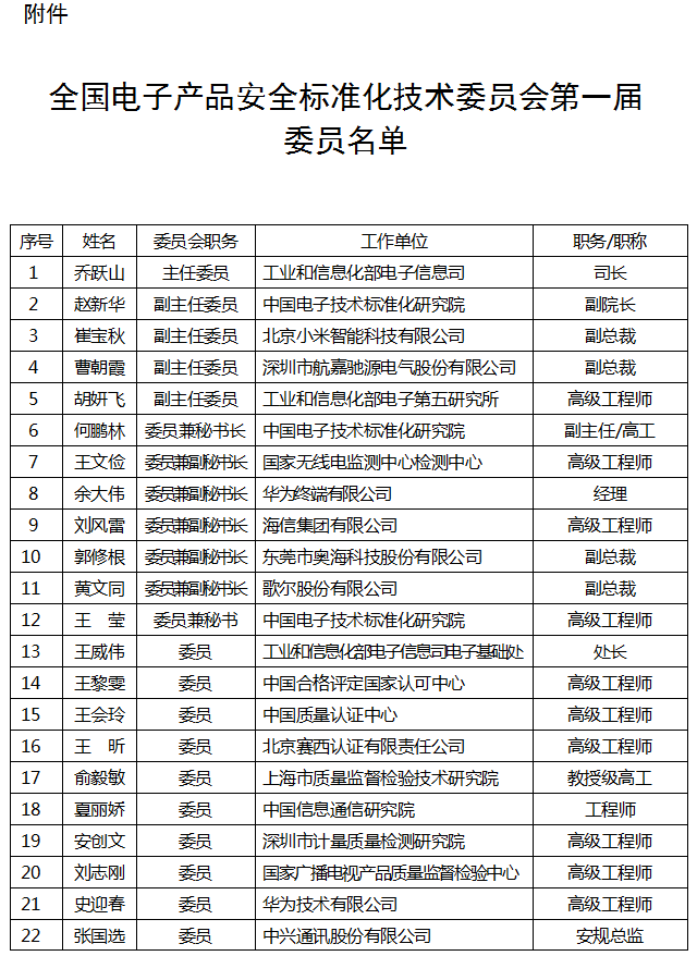 根据国家标准化管理委员会的批复,有关单位提出了全国电子产品安全标准化技术委员会组建方案。为进一步听取各方意见,现将委员名单予以公示,截止日期2020年6月12日。如有不同意见,请在公示期间将意见反馈至工业和信息化部科技司,电子邮件发送至KJBZ@miit.gov.cn(邮件主题注明:全国电子产品安全标准化技术委员会组建公示反馈)。