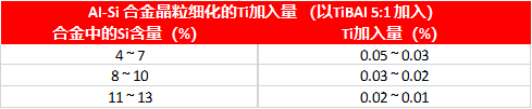 硅在合金中的含量影响着Ti和B对晶粒细化的效果。含硅越高的铸造合金,要求加入晶粒细化剂的数量就越多。典型加入量如下表。