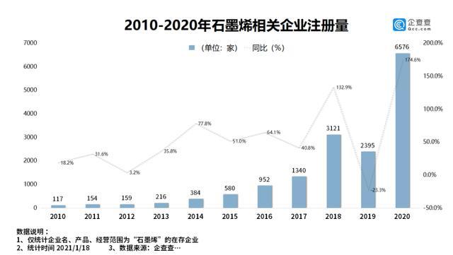 近十年我国石墨烯企业的注册量呈增长趋势,其中2018年和2020年是注册量的高峰期。企查查数据显示,2017年之前年注册量均在1000家以内,2018年注册量突破3000家,同比增长了132.9%。2020年更是突飞猛进,注册量为6576家,同比增长了174.6%。