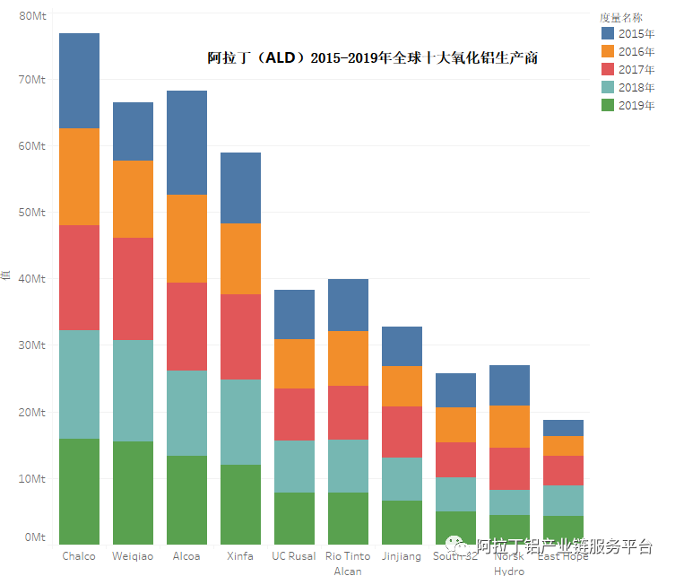 据统计数据显示,2019年全球十大氧化铝生产商(按照产量统计排序)依次是中国铝业(位次与上年持平)、魏桥集团(位次与上年持平)、美国铝业(位次与上年持平)、信发集团(位次与上年持平)、俄罗斯铝业(位次较上年上升一位)、力拓加铝(位次较上年下降一位)、锦江集团(位次与上年持平)、南拓32(位次与上年持平)、挪威海德鲁(位次较上年上升一位)、东方希望(位次较上年下降一位)。