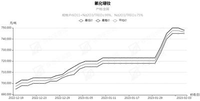截至2月3日,部分稀土氧化物产品报价为:氧化镨钕产品价格为74.5万~75万元/吨,氧化钕产品价格为80万~80.5万元/吨,氧化镝产品价格为244万~245万元/吨,氧化铽产品价格为1385万~1390万元/吨,氧化钆产品价格为45万~45.5万元/吨,氧化钬产品价格为94万~95万元/吨。