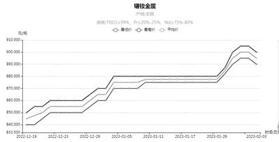 截至2月3日,部分稀土金属产品报价为:金属镨钕产品价格为89.5万~90万元/吨,金属钕产品价格为98.5万~99.5万元/吨,镝铁产品价格为244万~245万元/吨,金属铽产品价格为1745万~1755万元/吨,钆铁产品价格为42.5万~43万元/吨,钬铁产品价格为95万~97万元/吨。