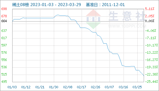 3月稀土市场行情大幅走低,下游磁材企业询单稀少,磁材厂多以消耗现有库存为主,稀土实际成交价格重心不断下移,稀土行情承压走低。近期来看稀土金属与氧化物价格同时下跌,金属厂的原料成本倒挂情况短期仍难缓解,部分金属厂降负生产。近期下游用户需求尚未明显增加、稀土制造商产能持续释放和部分贸易商看空市场,在下游采购方消费能力持续不足的情况下,市场信心仍旧低迷,稀土从业者的观望情绪也进一步加重,多重利空因素叠加,国内轻稀土市场价格大幅下滑。