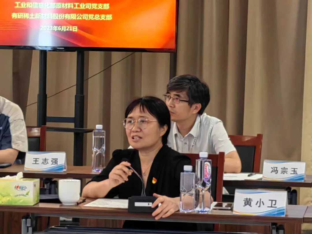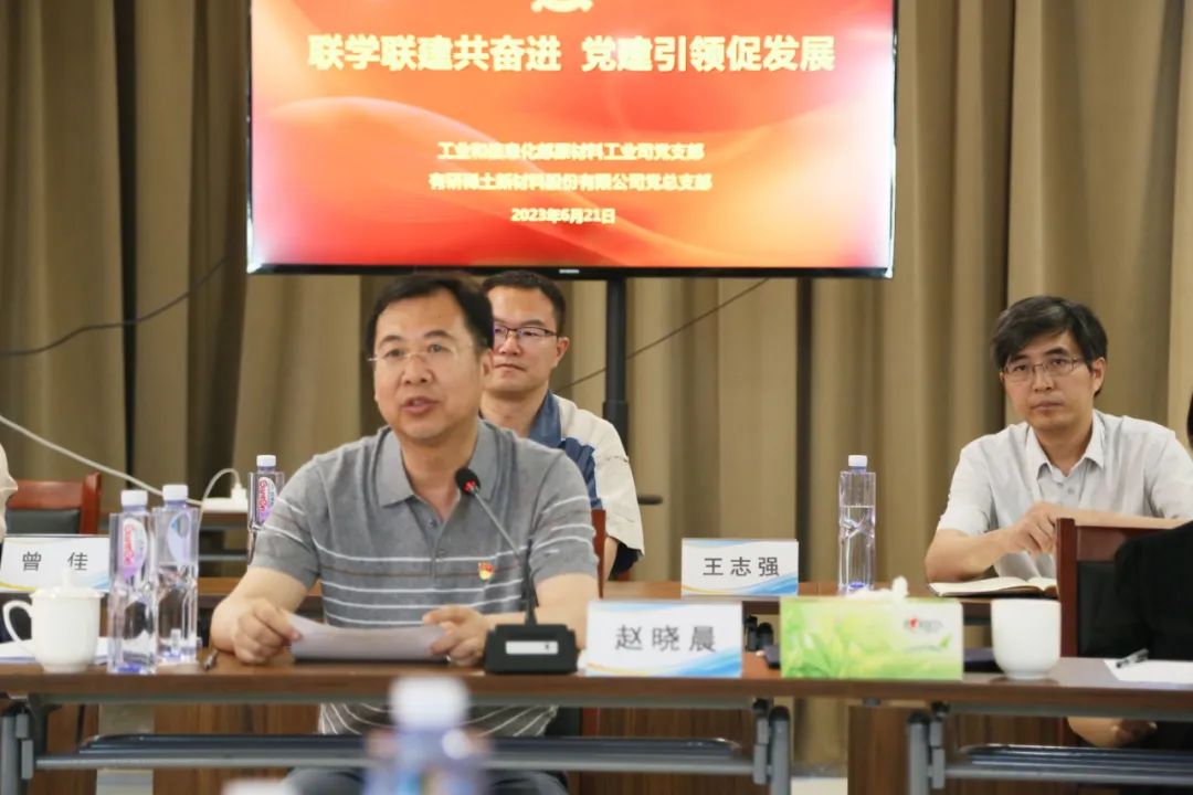 为深入学习贯彻习近平新时代中国特色社会主义思想和党的二十大精神,全面落实习近平总书记关于推动稀土产业发展的重要指示精神,共谋稀土行业绿色可持续发展之路,6月21日,工业和信息化部原材料工业司党支部联合有研稀土新材料股份有限公司党总支在燕郊基地开展“联学联建共奋进、党建引领促发展”活动。工信部原材料工业司司长陈克龙,副司长冯猛、张海登,中国有研党委书记、董事长赵晓晨,首席科学家、中国工程院院士黄小卫,党委委员、副总经理周旗钢出席活动。中国有研党委副书记王兴权主持活动。