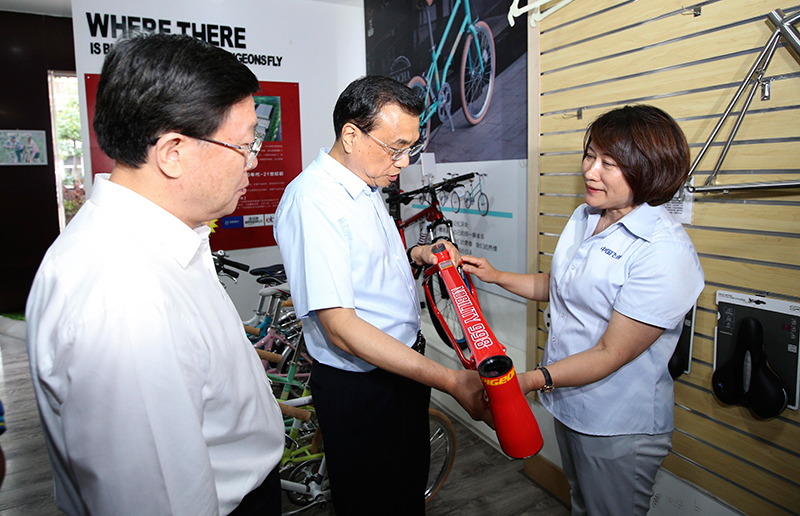 李克强总理26日走进飞鸽自行车天津胜利路体验店。这里摆放着不同档次、材质和性能各异的自行车。总理来到一辆碳纤维自行车前掂了掂重量,又亲自体验了一下这辆超级智能自行车的性能。他说,我愿为中国自行车做广告,更愿为“中国制造”智能升级“站台”。