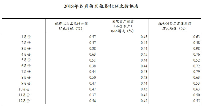 (2)根据季节调整模型自动修正结果,对近一年来各期国内生产总值、规模以上工业增加值、固定资产投资(不含农户)、社会消费品零售总额环比增速进行修订。修订结果及2018年四季度GDP环比数据、2018年12月份其他指标环比数据如下: