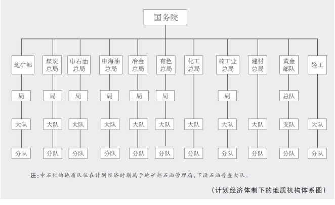 图表中的这个体系,是一个以地质队为核心的地质工作机构体系。到20世纪80~90年代,地质队的改革呼声日益高涨,人们已经认识到地质队的计划经济体制面临新的选择,“地勘队伍”一词出现了。这个词既不代表计划经济的地质队,也不代表转型后的矿产勘查市场主体,而是居于两者之间的一个临时身份名称。因此“地勘队伍”不可能永久存在,等到改革到位,成为市场主体后,这个临时身份就消失了。