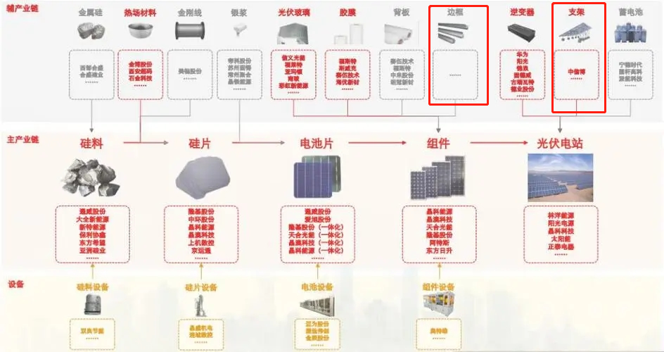 光伏组件通常由电池片、互联条、汇流条、钢化玻璃、EVA、背板、边框、硅胶和接线盒等九大部分组成,其中边框主要是铝合金型材制成,是光伏用铝的主要部分之一。除光伏组件外,光伏发电系统或应用产品的安装过程需要光伏支架,而铝合金型材是用于制造光伏支架的一种。