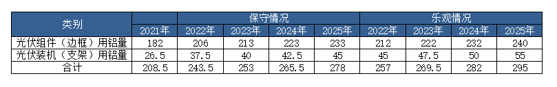 前文对光伏领域中组件边框以及支架单位耗铝量的测算,结合中国光伏行业协会对2021-2025年国内新增装机量的保守和乐观情况的预期对用铝量进行预测,其中组件用铝单位耗铝量取1万吨/GW,光伏支架部分用铝单位耗铝量取0.5万吨/GW。根据测算,在保守情况下,2022年光伏用铝量至少为243.5万吨,2023-2025年光伏用铝量为253-278万吨;而乐观情况下,这一数值扩大至257-295万吨。