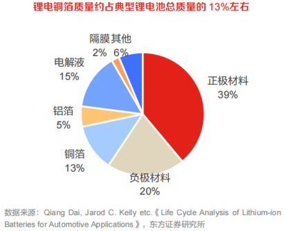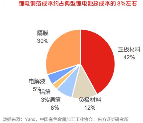 铜箔占锂电池总重量比例约为13%,仅次于正极材料、负极材料和电解液,是影响电池质量能量密度的关键原料。成本方面,NCM811锂电池中铜箔占总成本比例约为8%,仅次于正极材料,是影响电池成本的关键原材料之一。