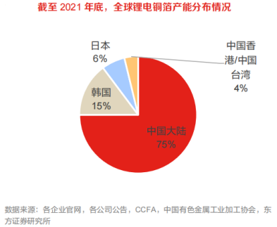 2021年底中国大陆、韩国锂电铜箔产能的合计占比高达90%,2022-2023年锂电铜箔新增产能也主要来自这两个地区。截至2021年底,中国大陆、韩国、日本、中国香港/中国台湾锂电铜箔产能占比分别达75%、15%、6%和4%,中国大陆和韩国是锂电铜箔主要产区。
