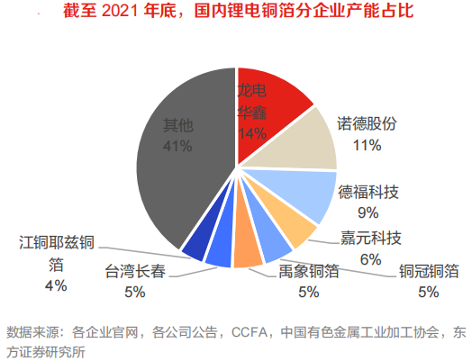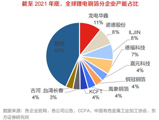 从国内看,截至2021年底,龙电华鑫、诺德股份、德福科技的产能占比均在9%以上,为第一梯队;嘉元科技、铜冠铜箔、禹象铜箔、台湾长春和江铜耶兹铜箔产能占比均在4%以上,为第二梯队。