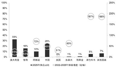 分国家锂资源供给占比及2022-2025年增速