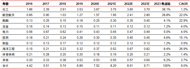 航钛产品需求快速增长以及应用领域拓宽将拉动国内钛材需求量稳定增长。伴随航天航空领域的拉动,中信证券研究部预计 2020-2023 年我国钛材消费量将达到 7.5/8.3/8.9/9.7 万吨,2019-2023 年 CAGR 为 9.0%。中长期看,钛材需求将伴随下游应用领域的拓展而呈现稳定增长态势。