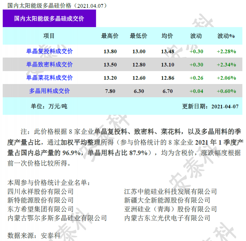 本周多晶硅价格延续涨势,但涨幅略有收窄,其中复投料、单晶致密料、单晶菜花料成交价涨幅区间在2%-3%。本周多晶硅价格继续呈上涨走势的根本原因,仍是目前硅料阶段性供不应求;价格涨幅收窄则主要是由于,本周绝大部分硅料企业陆续签订4月份长单价格,长单签订数量大且价格相对较低,即便本周有少量散单以相对高价成交,但经过与相对低价的长单硅料加权后,多晶硅周均价涨幅则有所收窄。