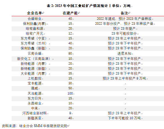 结合多方公告信息统计,2023年工业硅新增产能较多,加上2022年投产但未能释放产量的部分,合计约有近200万吨产能释放,但多数实际投产预计会在下半年,上半年增产主要由2022年未释放产能贡献。