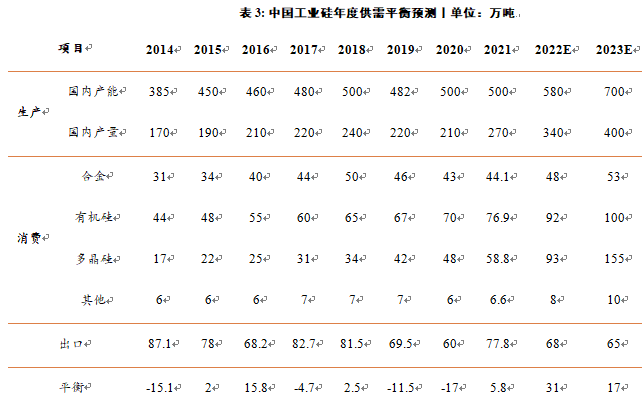 需求方面,明年多晶硅产量仍能保持高速增长,预计带动约62万吨工业硅新增需求,但从下半年开始,随着多晶硅产能大幅提升,对工业硅的需求将由终端光伏装机量决定,预计明年国内及海外光伏装机预计仍能保持较高增速。对于有机硅,目前产能相对过剩,尽管明年还有155万吨单体投产,但终端消费增长并不能与产能增长匹配,预计全年产量增长在10%左右,带动约10万吨工业硅新增需求。铝合金新增量相对较少,预计整体增速在5%左右,会带来3-5万吨工业硅新增需求。出口端,预计2023年出口会继续回落,全年出口量在65万吨,减少3万吨左右。