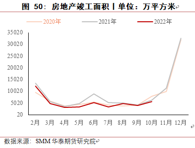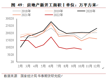 2022 年 1-10 月土地购置面积累计值达 7432 万平方米,同比减少53%,达近 15 年最低水平。新开工面积与施工面积走势也呈现低迷走势,2022 年 1-10月新开工面积 103722 万平方米,同比下降 37.8%,2022 年 1-10 月施工面积为 888894万平方米,自 5 月以来呈负增长,10 月同比下降 5.7%。