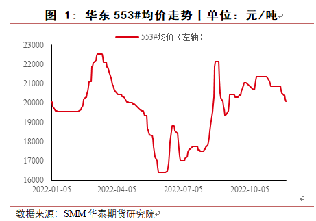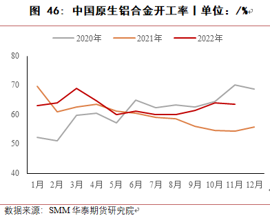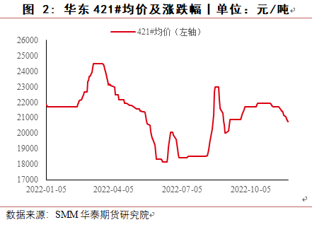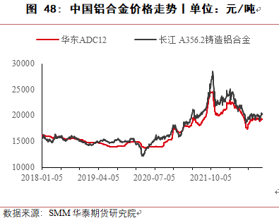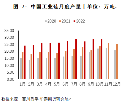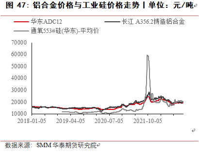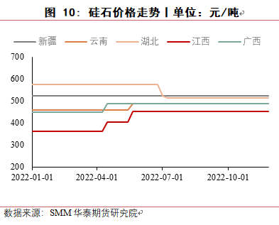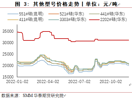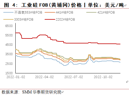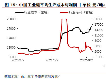 8月份,四川地区电力短缺,当地工业硅生产受到很大影响,绝大多数工厂停产,同时新疆受运输受阻影响,当地硅厂原料及产品运输出现困难,使得工业硅价格反弹上涨,华东553价格最高涨至22150元/吨,421价格涨至23000元/吨,8月底随着四川生产恢复,下游有机硅与多晶硅成本压力较大,终端消费低迷,对工业硅价格有较强抑制作用,价格回落。9月至10月,受到疫情及西南地区限电减产预期及期货上市预期影响,价格小幅上涨,提前抵消枯水期成本上涨影响。11月进入枯水期,西南地区生产成本大幅上涨,但受有机硅与铝合金利润较低且终端需求低迷影响,工业硅价格不涨反跌。