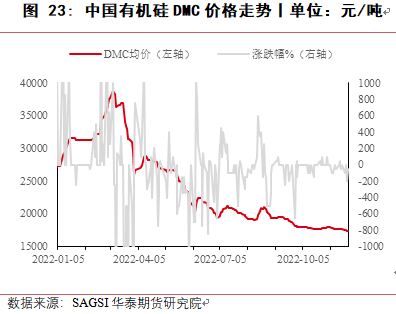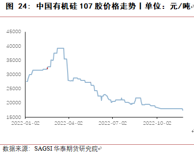 从建筑领域使用有机硅产品类别来看,2022年由于新开工及竣工面积均有减少,幕墙结构胶使用量有所下滑,但随着有机硅胶价格下跌,对其他产品胶有一定替代,尤其是玻璃胶、室内装修胶等,使得有机硅在建筑领域用量降低幅度不大。2023年随着地产“十六条”对稳定地产市场信心的积极作用,预计随着房地产开发资金来源持续改善,目前地产端下跌的趋势可能会有一定缓解,同时有机硅原料价格较低,能够替代部分其他产品,有机硅在建筑领域消费量有望维持稳定。